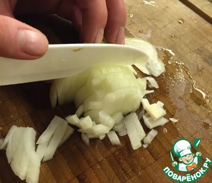 Пока кабачок жарится, режем лук кубиками. Отправляем его к кабачкам.