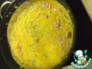 Выливаем все к нашей овощно-сосисочной зажарке и хорошо перемешиваем.