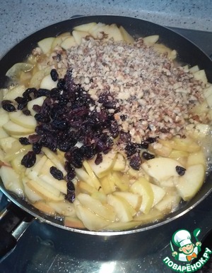 Готовим яблочную начинку для штруделя. Нарезать яблоки тонкими ломтиками. Залейте изюм кипятком и оставьте на 10 мин. Затем слейте воду и обсушите его. Далее растопим часть сливочного масла (70 г.) в среднего размера сковороде на среднем огне (оставшуюся часть масла мы будем использовать позже). В масло добавляем сахар и растапливаем его. В растопленную массу выкладываем яблоки, добавляем корицу. Тушим 5-7 минут не накрывая (нам необходимо чтоб жидкость выпарилась), периодически помешивая. Добавляем туда затем изюм и орехи и тушим до полного испарения влаги порядка 3-5 минут. Перекладываем готовую начинку в другую посуду и даем полностью остыть.
