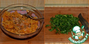 Всю курагу перемешать с оливковым маслом, солью и перцем. Зелень петрушки измельчить ножом.