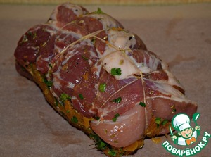 Начинку накрыть верхним слоем мяса и перевязать нафаршированный кусок свинины кулинарной нитью.