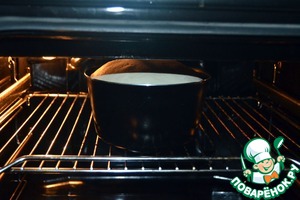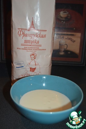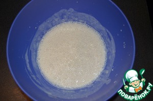 Из оставшегося кефира и небольшого количества муки замесить жидкое тесто (как на оладьи) добавить к нему настоявшуюся смесь из кефира, дрожжей и сахара. Поставить емкость с опарой в теплое место на 2-3 часа.
