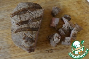 Стейк нарезать мелкими кубиками.
