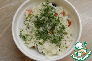 Добавить рис (он должен быть рассыпчатым) и измельченный укроп.