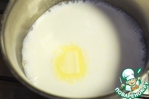 В молоко добавляем сливочное масло, сахар, ваниальный сахар и доводим до кипения.