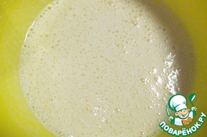 Яйца с сахаром и ванильным сахаром взбиваем до пышной белой массы. Продолжая взбивать, добавляем растопленное масло