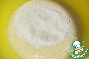 Небольшими порциями вводим просеянную муку и разрыхлитель, перемешиваем.