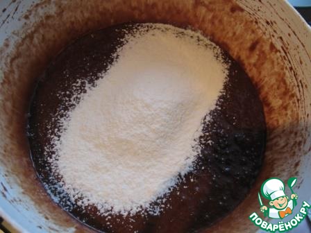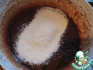 Шоколадно-масляную смесь вмешать в яичную, сверху просеять муку.