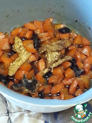 Морковь (сырую) нарезать кубиками и отправить вариться в пряный сироп. Варить около 10-15 минут, пока сироп не закарамелизуется.