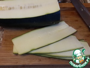 Цуккини нарезать тонкими полосками вдоль с помощью тонкого ножа или специальной терки