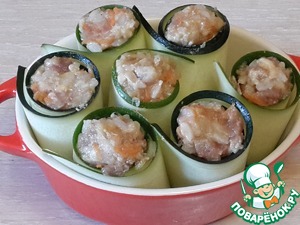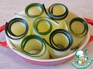 Свернуть цуккини в трубочки и установить вертикально в формочку для запекания