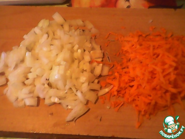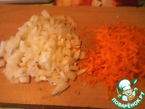 Нарезаем лук, трем морковь. На сковороду нальем чуть масла, выкладываем лук и жарим до полуготовности. После добавляем морковь и все обжариваем до золотистости.