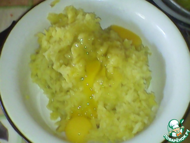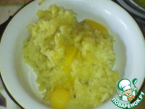 Готовый картофель остужаем, очищаем от кожуры, трем на терке. Добавляем два яйца, чеснок, любимые специи.