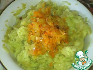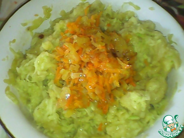 Добавляем зажарочку из лука и моркови и кабачки. Пять столовых ложек муки смешаем с содой и добавим к нашему овощному фаршу. Хорошо перемешиваем.