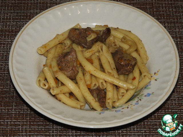 Печенку тушим минут 10-12, при тушении печень выделяет сок, который будет соусом к блюду. Отваренные макароны отправляем в сковороду, все перемешиваем и тушим ещё 3-5 минут. Даем настояться и можно подавать к столу.