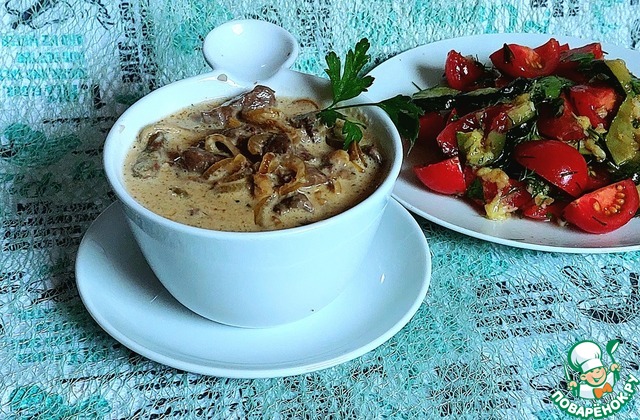 Растопим 2 столовой ложки сливочного масла, жарим муку, лук - до коричневого цвета, добавляем сливки, 1 стакан воды, кубик.