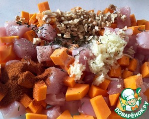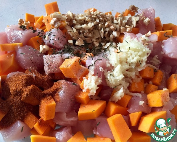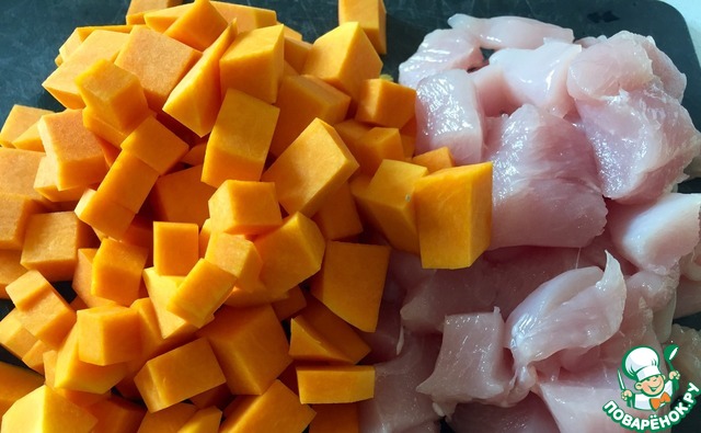 Курочку нарежьте небольшими кусочками. Тыкву квадратиками. Тоже небольшими. Мы не станем заранее обжаривать курицу. Все приготовится уже в пироге.
