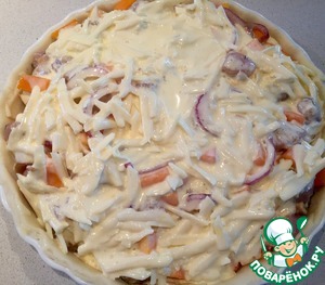 Сверху, слегка отжимая лишнюю влагу, нашу курочку с тыквой. Сверху сливки, взбитые с яйцами и сыром. Моль и перец по вкусу.