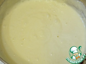 После того, как ягоды и тесто готовы, мы взбиваем яйца с сахаром до плотной пены. Добавляем творог и ванилин и снова взбиваем. Масса получается жидковатой, но это так и должно быть.