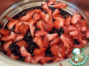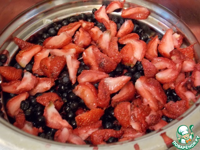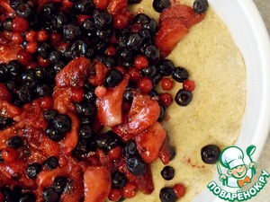 Тесто достаем с холода и делим на две части - на 1/3 и 2/3. Большую часть тонким слоем (без бортиков) разравниваем в форме 22 см. Сверху укладываем ягоды.