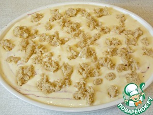Заливаем творожной массой. Остатки теста рвем руками на маленькие кусочки и кладем сверху.