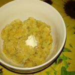 Яблоки, лучше всего антоновка, очистить от кожуры и семян, нарезать мелкими кубиками. Добавить кипяток, сахар и хлопья. Все перемешать. Кладем в тару для СВЧ (она должна быть выше, чем масса, примерно в 2 раза) и включаем на 5 мин. при мощности 800 Вт. Затем добавляем масло и еще на 5 мин. при той же мощности. Если вам показалось, что яблоки не дошли, то перемешайте и подержите еще 5 мин.