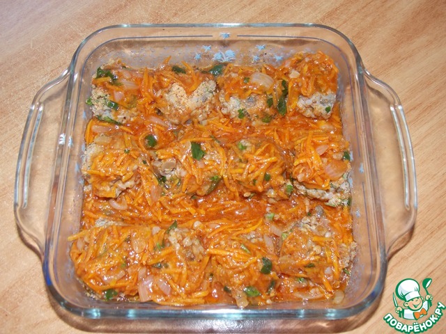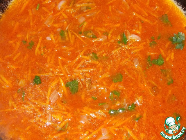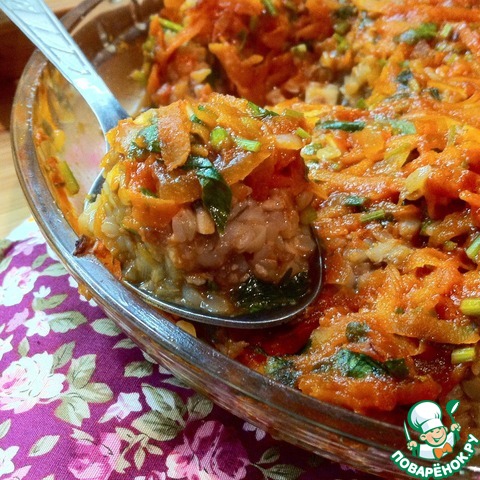 Приготовить соус. Обжарить в 1ст. л. растительного масла лук и морковь, добавить 50мл воды и 1ст. л. томатной пасты. Немного потушить, добавить немного зелени, соль и перец по вкусу.