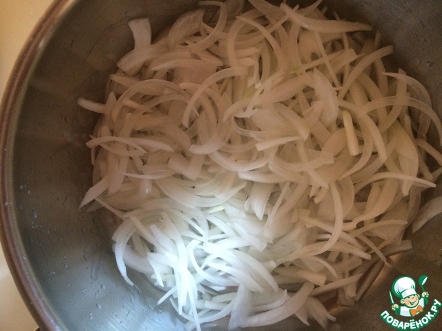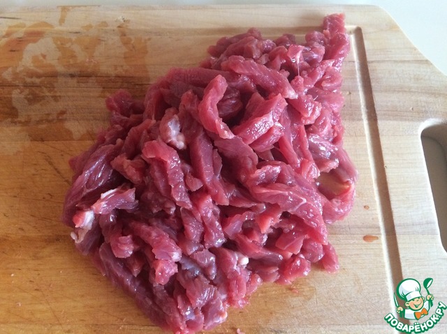Нарезаем говядину соломкой и отправляем ее тушиться до готовности. Присаливаем совсем немного. У меня ушло чуть больше 1 часа.