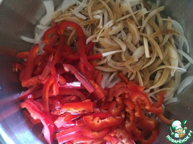 Далее идет очередь перца, его тоже шинкуем соломкой и отправляем к луку. Поливаем все соевым соусом.