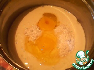 В кефир разбиваем два яйца, добавляем пудру, соль, соду., масло.