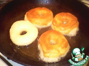 Наливаем масло в сковороду, когда хорошо разогреется кладем наши пончики, чтобы покрыло половину пончика.