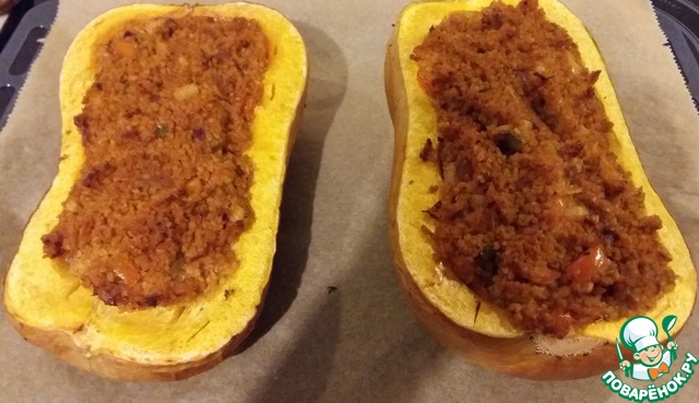 Выпекать в предварительно разогретой духовке при температуре 160 градусов примерно 60 минут (пока тыква не станет мягкой).