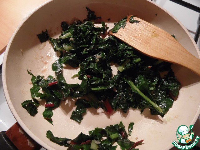 На растительном масле слегка обжарить измельченный чеснок, добавить нашинкованный шпинат (мангольд), 2 ст. л. воды, посолить, попречить, тушить 4-5 минут