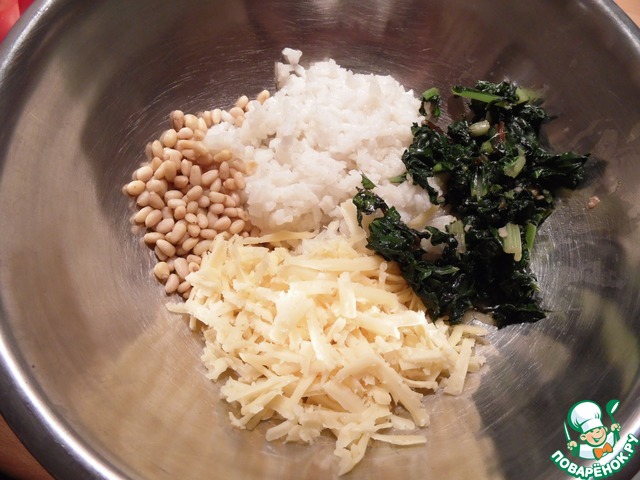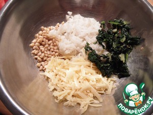 Смешать рис, шпинат, натертый на крупной терке сыр и кедровые орешки.