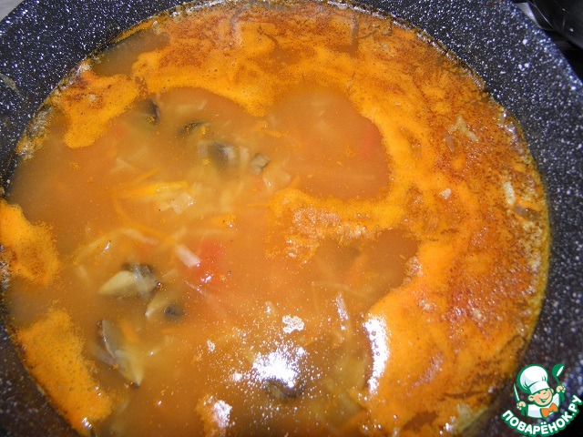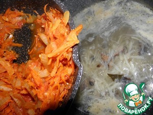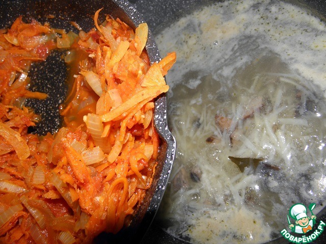 Грибы, ( если лесные сначала отварить) слегка обжарить на сковородке, и добавить в кипящий бульон.
