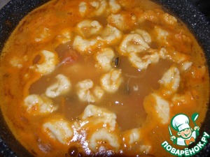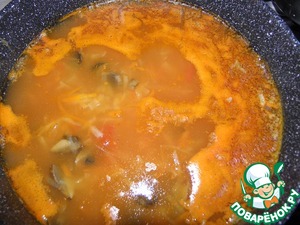 Лук нарезать ( если порей, только белую часть) Морковь можно натереть, а можно нарезать брусочками, как любите. Обжарить на растительном масле лук с морковью, добавить банку помидор в с. с., добавить чеснок (через пресс), черный перец, и шафран на кончике ножа. Потушить 5 минут.