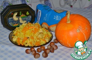 Мясо, тыкву и лук нарезать кубиками, морковь брусочками, орехи измельчить.