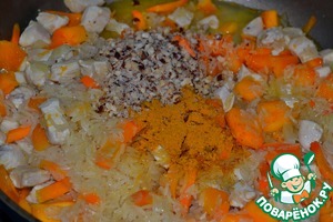 Добавить промытый рис, карри, орехи, соль и перемешать.