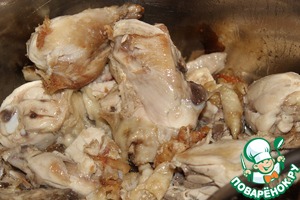 Курицу положить в кастрюлю с 2 литрами кипящей воды, варить до полуготовности, от 30 минут до 1 часа.