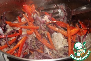 Сладкий перец очистить, тонко нарезать. Добавить в кастрюлю, тушить на слабом огне примерно 5 минут. Налить 1 стакан бульона (оставщийся бульон от курицы больше не понадобится), закрыть кастрюлю крышкой и тушить до полного размягчения куриного мяса, примерно 40 минут.
