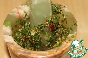 Чеснок и кинзу крупно нарезать, положить в ступку, растолочь с солью в пасту ( я использовала блендер) и добавить в кастрюлю, увеличить огонь до среднего, перемешать и готовить 10 минут
