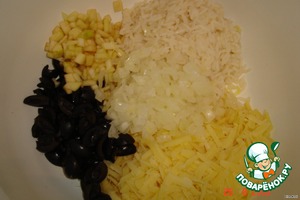 Маслины разрезать пополам вдоль, яблоко кубиками, сыр на крупной тёрке.