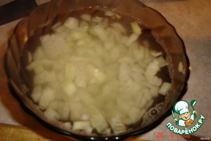 Лук мелко нашинковать и залить кипятком на 20 минут.