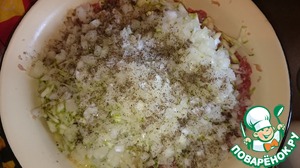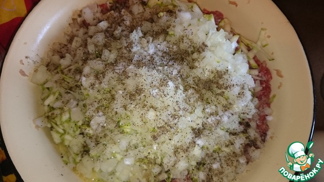 Головку лука мелко порезать и отправить к фаршу. Посолить, поперчить по вкусу. Перемешиваем.