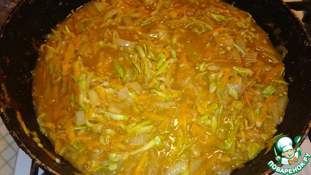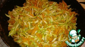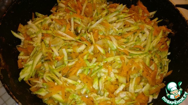 Лук мелко режем, морковь и кабачки трем на крупной терке. В небольшом количестве растительного масла обжариваем 5 минут лук с морковью. Добавляем кабачок и жарим еще 5 минут.