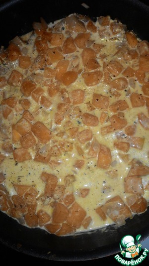 Режем мелкими кубиками тыкву и луковицу. Обжариваем на большом огне 5 минут, солим, перчим и добавляем специи (Хмели-сунели, Кари). Заливаем сливками, накрываем крышкой и тушим на медленном огне 20-30 минут, иногда помешивая.