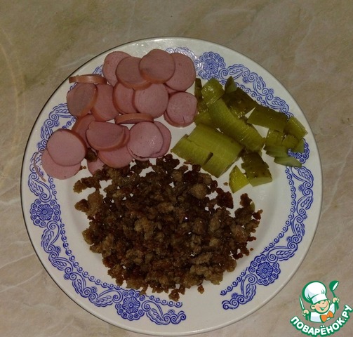 Огурец и сосиску порезать, как кому удобно. Фарш обжарить, посолив.