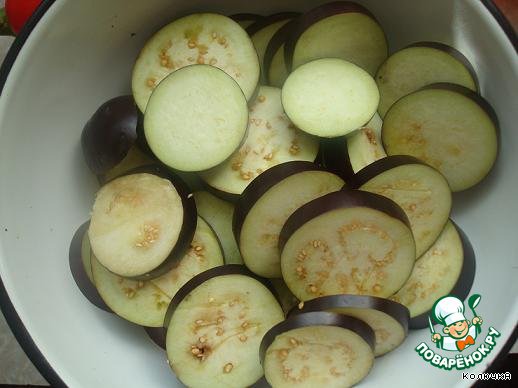 баклажаны режем колечками и заливаем водой с солью что бы вышла горечь