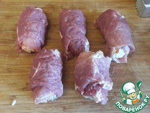 Ломтики мяса отбить, посыпать солью и перцем, положить начинку и свернуть рулетиком.