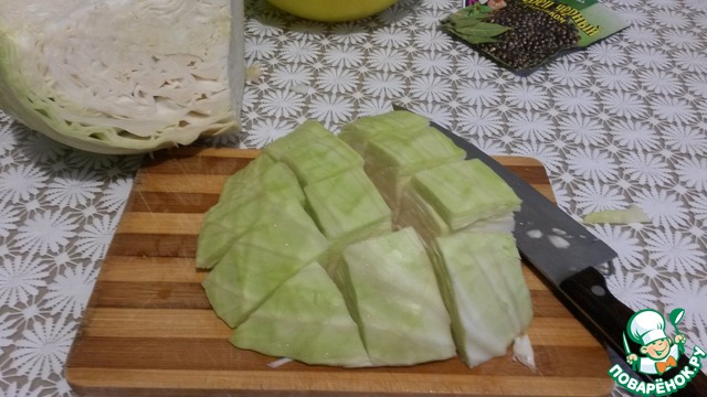 С кочана капусты снять верхние листья, и нарезать примерно на одинаковые куски размером 6-7 см.
